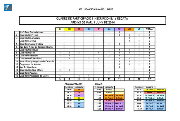 Demà comença la 12a Lliga Catalana de Llagut, a partir de les 9 del matí a Arenys de Mar. Serà la primera prova de les set previstes per la  temporada 2014, que acabarà a finals de setembre amb el Campionat de Catalunya a Cambrils.